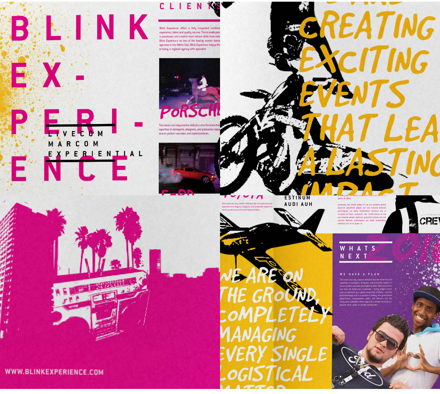 For a recent event taking place in Abu Dhabi, Blink asked us to create a self-promoting brochure to be distributed during the show. Shown here (top) is the initial concept, a fold out design using custom illustrations. This was felt to be a little too far off brand, resulting in a more sophisticated and considered design to be proposed.