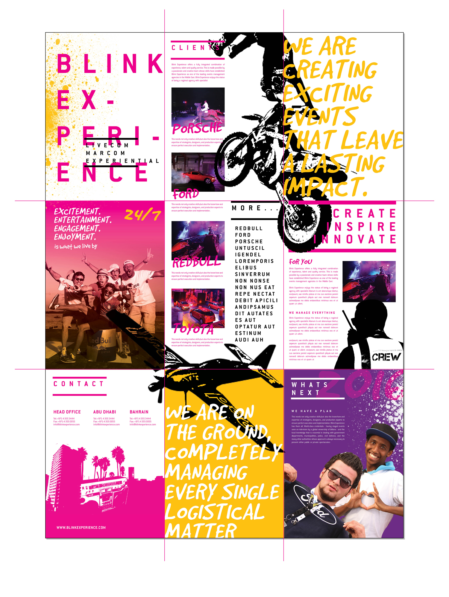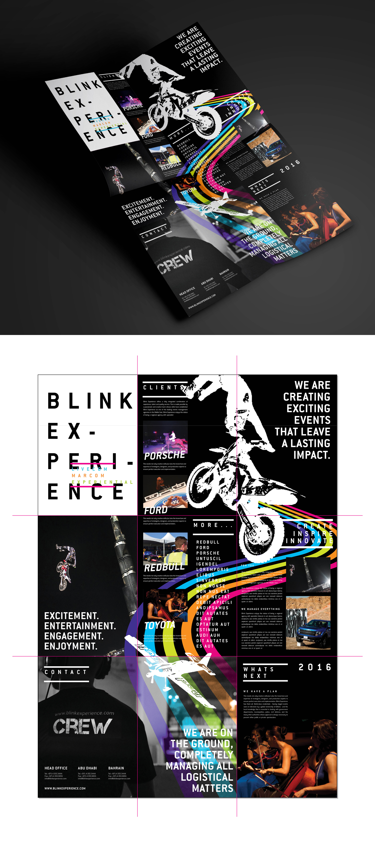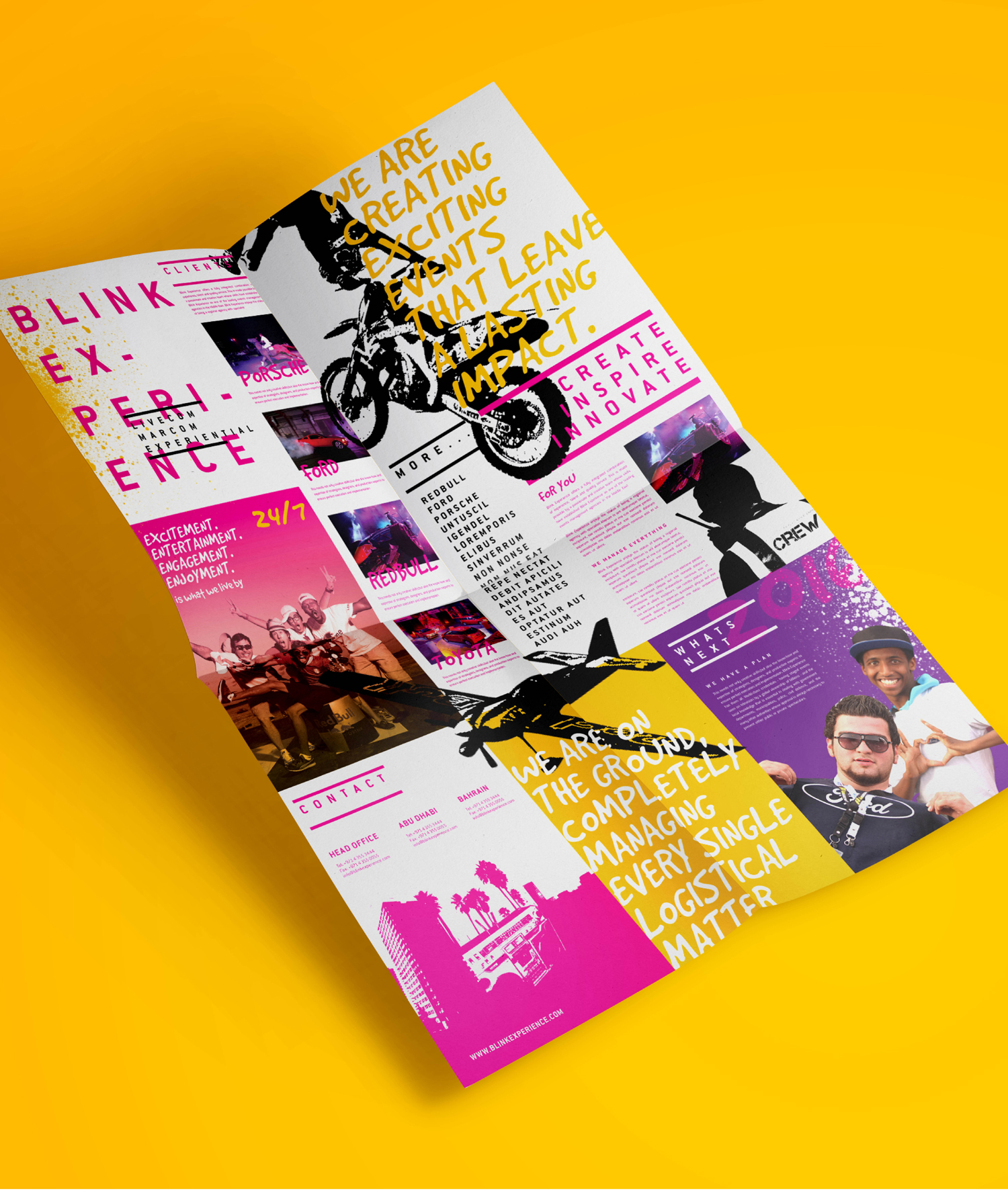 For a recent event taking place in Abu Dhabi, Blink asked us to create a self-promoting brochure to be distributed during the show. Shown here (top) is the initial concept, a fold out design using custom illustrations. This was felt to be a little too far off brand, resulting in a more sophisticated and considered design to be proposed.